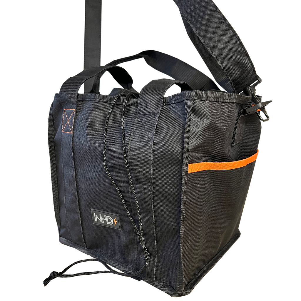 Geschikt voor 12 blikken en voorzien van een verstelbare schouderband met schouderpatch, twee lange handvatten(zodat je de tas ook onder je oksel kunt dragen), twee zijvakken en voorzien van kenmerkende NHD details. Geen rits maar een trekkoord sluiting.